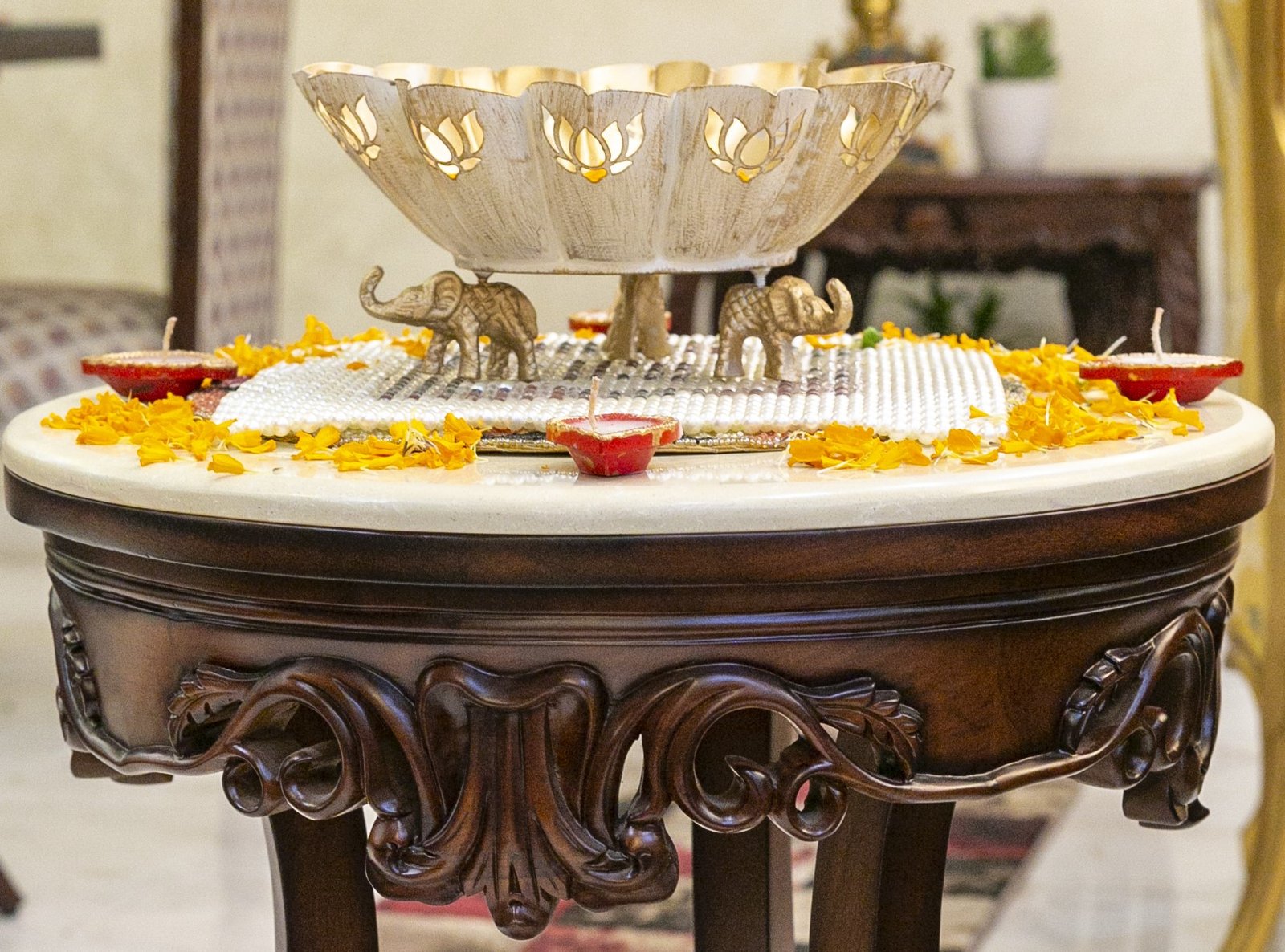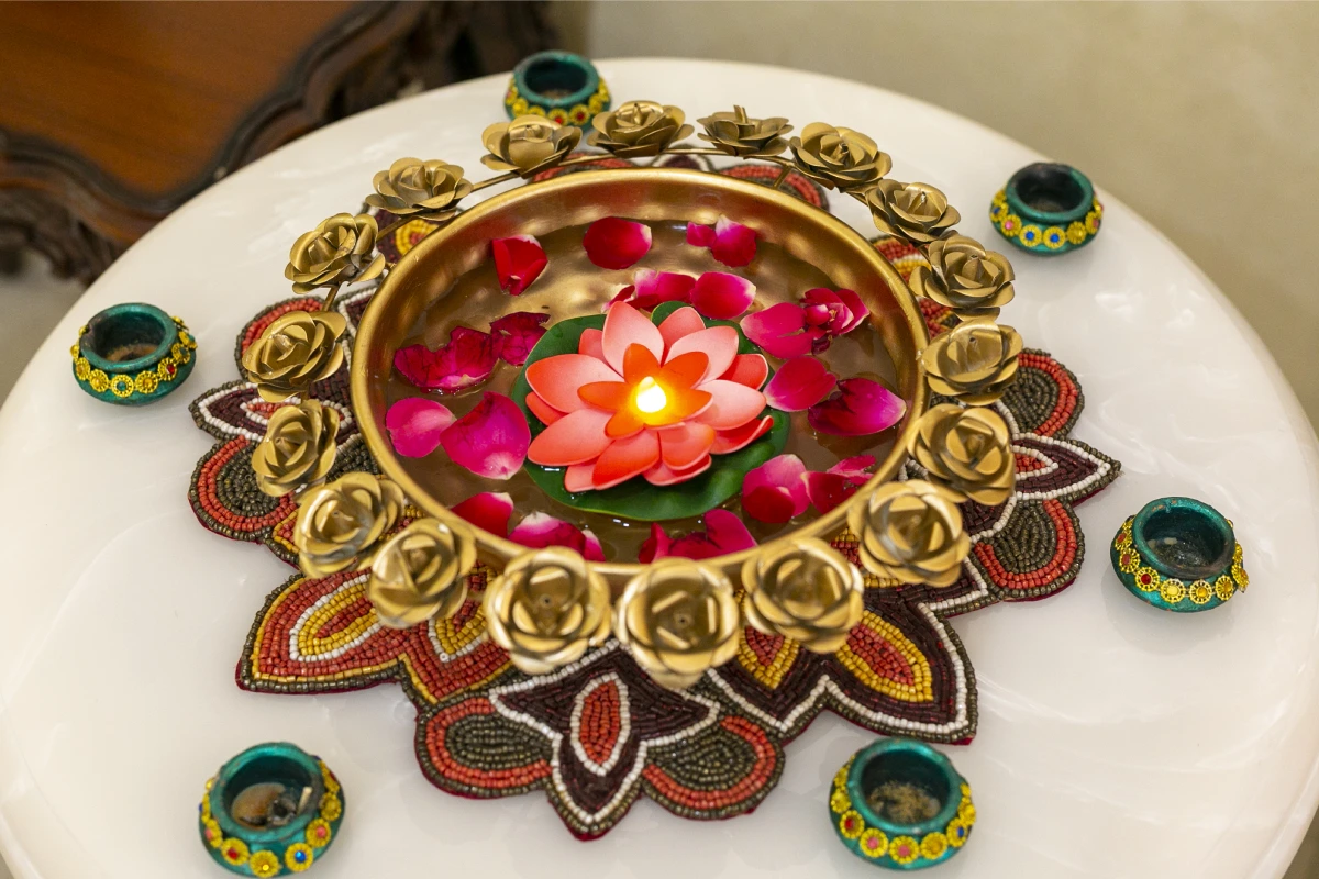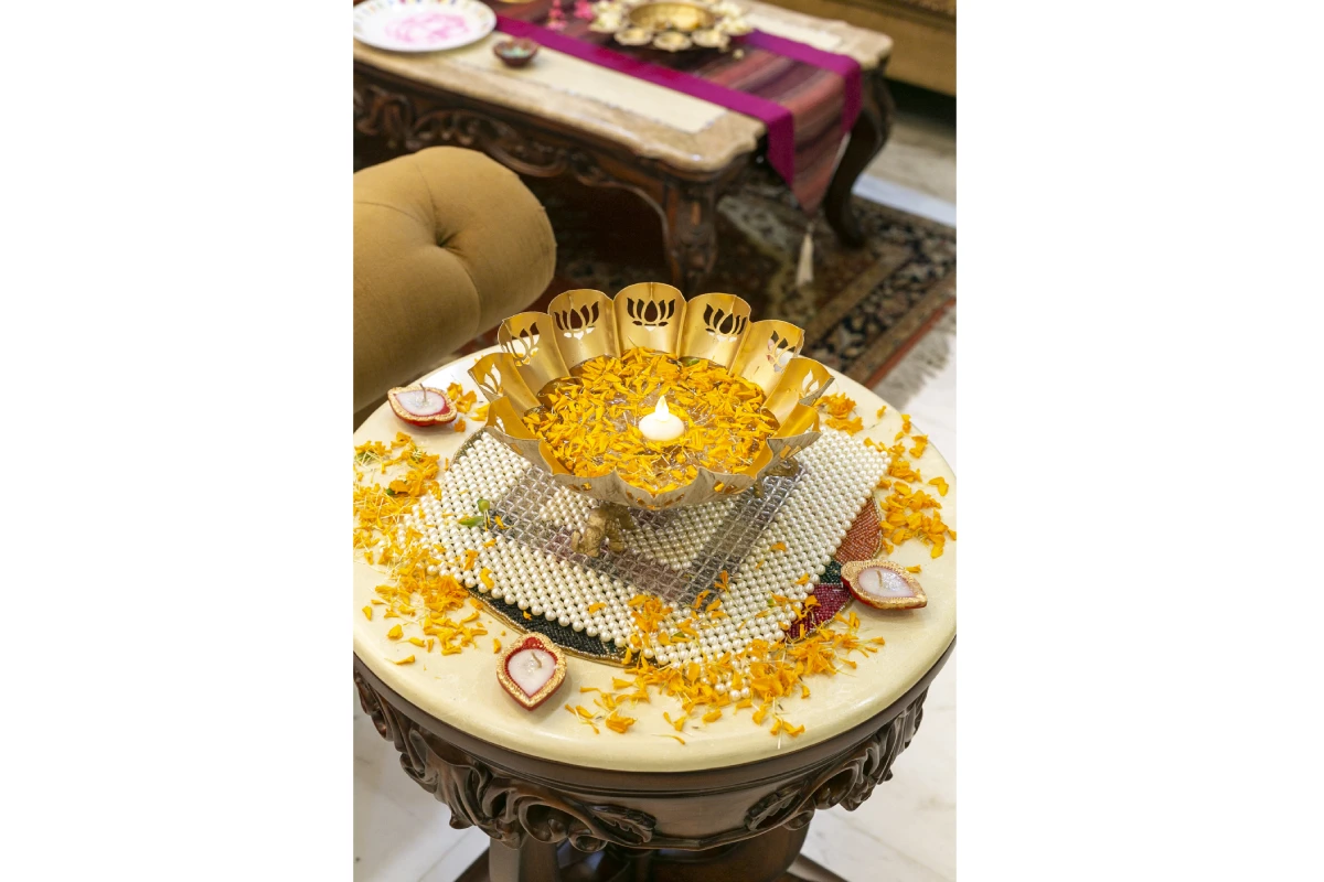 Transform your space with the grace of a lotus. This exquisite cut-out urli is not just a vessel for fresh flowers and twinkling lights; it’s an embodiment of elegance. Welcome the festive spirit into your office and home, and place it in your foyer to offer your guests a warm and inviting embrace this Diwali.
